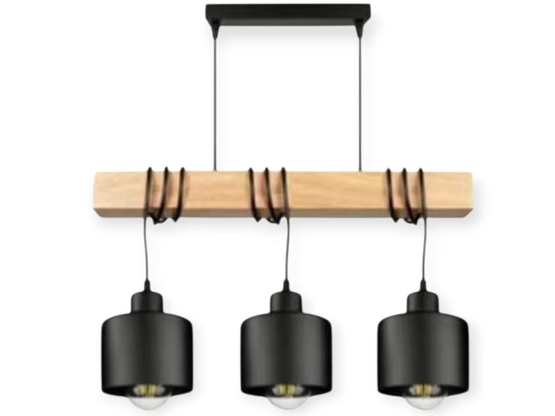 A modern and stylish triple pendant light fixture. Its design features a clean, wooden horizontal beam from which three identical black pendants wrap around and hang. The wood adds a natural warmth, contrasting beautifully with the sleek matt black finish of the lampshades, which emphasize a minimalist aesthetic.