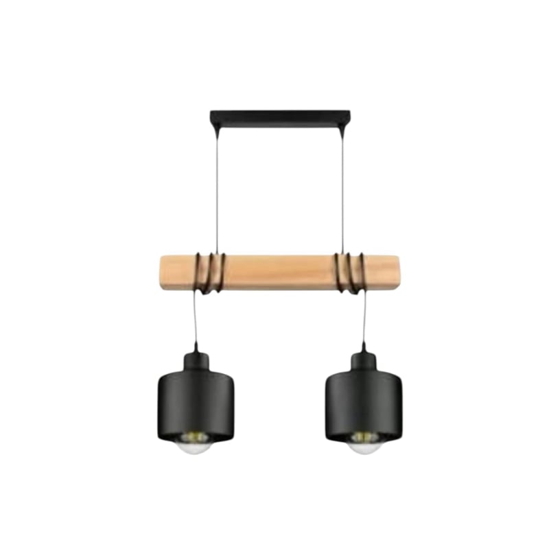 A modern and stylish double pendant light fixture. Its design features a clean, wooden horizontal beam from which two identical black pendants wrap around and hang. The wood adds a natural warmth, contrasting beautifully with the sleek matt black finish of the lampshades, which emphasize a minimalist aesthetic.